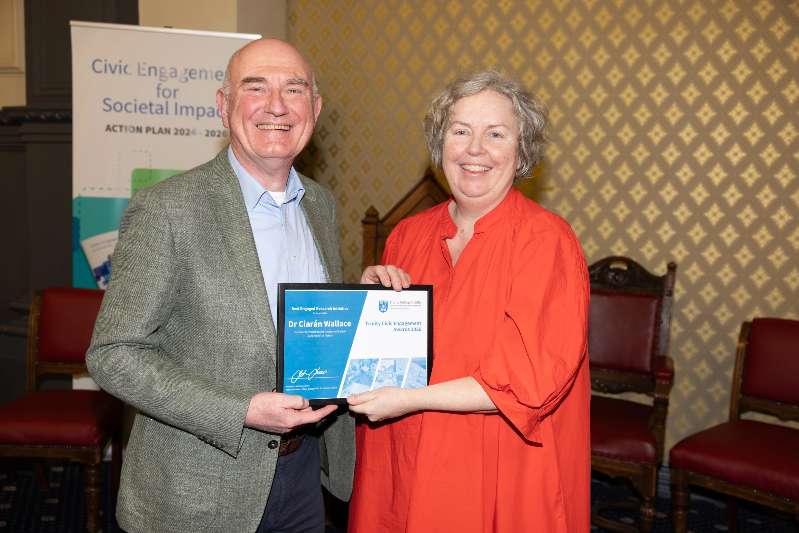 Congratulations to Dr Ciarán Wallace on his Civic Engagement AwardPresented by the Provost at a ceremony on 5 December, this award was recognition of an initiative Ciarán has developed with the Virtual Record Treasury of Ireland to create a toolkit to promote improved digital inclusion for older people.