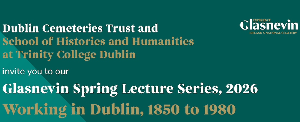 13th Annual Spring Lecture Series for 2026The School of Histories and Humanities in conjunction with our partners at Dublin Cemeteries Trust, are delighted to announce the line-up for our 13th Annual Spring Lecture Series for 2026. The theme this year is work, working and workers, at various sites across Dublin including Glasnevin Cemetery, Jacob`s Factory, pawnbrokers and RTE, during the 19th and 20th centuries. We are delighted to host various speakers including Dr Conor Dodd (Garda Museum), Dr Antonia Hart (Dublin Historian in Residence), Dr Deirdre Foley (TCD) and Dr Morgan Wait (UCD). Attendance is free, but booking is advised as space is limited. Click for contact details. -